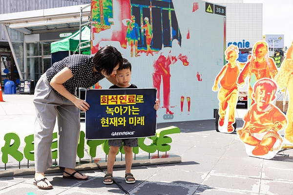 그린피스는 이날 열 화상 퍼포먼스와 함께 기자회견을 하며 "끓는 지구의 가장 큰 피해자는 청년과 아이들"이라며 "향후 젊은 세대가 입게 될 기후재난 피해가 기성세대보다 훨씬 심각하지만 기후위기 대응을 위한 온실가스 감축 책임은 공정하게 분배되지 않고 있다"고 지적하며 화석연료 종식을 촉구했다.