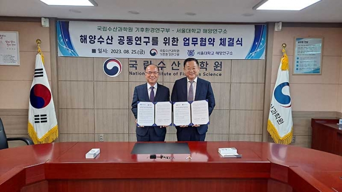 국립수산과학원 기후환경연구부와 서울대학교 해양연구소가 지난 25일 '해양수산 분야 기후변화 대응연구에 관한 업무협약'을 체결하고 '해양수산 분야 기후변화 및 현안 해결 연구방향'을 주제로 심포지엄도 개최했다고 28일 밝혔다.