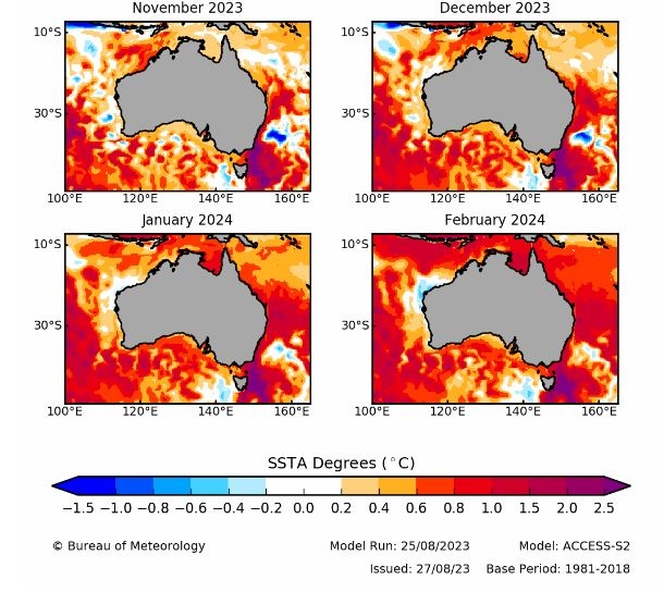 호주 기상청은 올해 9월부터 내년 2월까지 호주 태즈메이니아해와 빅토리아 연안의 태즈만의 해수면 온도가 평균보다 최소 2.5℃ 이상 높을 수 있다고 전망했다.