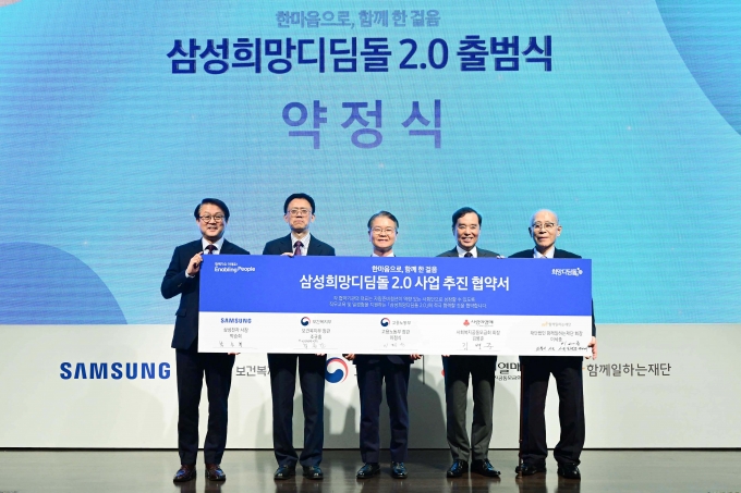 삼성은 29일 삼성전자 인재개발원에서 '삼성희망디딤돌 2.0' 출범식을 개최하고, 고용노동부, 보건복지부, 사회복지공동모금회, 함께일하는재단 등 4개 기관과 사업을 공동운영하기 위한 협약을 맺었다.