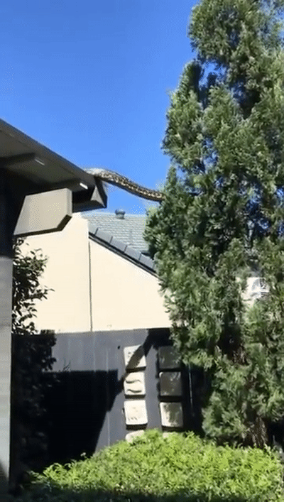 호주 퀸즐랜드 한 가정집에서 지난 29일(현지시간) 촬영된 이 영상에는 길이가 5m에 달하는 거대한 얼룩뱀이 지붕에서 나무로 이동하는 것이 찍혀있다. 나무로 이동한 뱀은 가족들을 향해 머리를 내밀어 영상촬영자와 함께 뱀을 구경하던 아이들은 기겁하며 울음을 터트렸다.