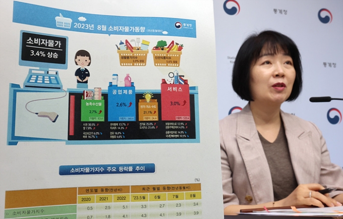 ▲2023년 8월 소비자물가동향을 발표하고 있는 김보경 통계청 경제동향통계심의관(사진=연합뉴스)
