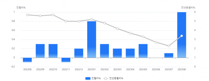 5일 통계청이 발표한 '2023년 8월 소비자물가동향'에 따르면 지난 8월 소비자물가지수는 112.33(2020년=100)으로 전년동월 대비 3.4% 상승해 올해 4월 3.7%를 기록한 뒤로 4개월만에 가장 큰 폭으로 올랐다. 물가상승률은 전월인 7월과 비교해 무려 1.1%가량 올랐다. 이는 2000년 9월 이후 최대 상승이다.