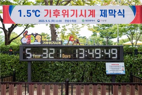 기상청과 대전시는 5일 대전 서구 한밭수목원에 '기후위기시계'를 설치했다고 밝혔다. 기후위기시계는 지구 평균 표면온도가 산업화 이전(1850~1900년)과 비교해 1.5℃ 높아지는 순간까지 남은 시간을 보여준다.