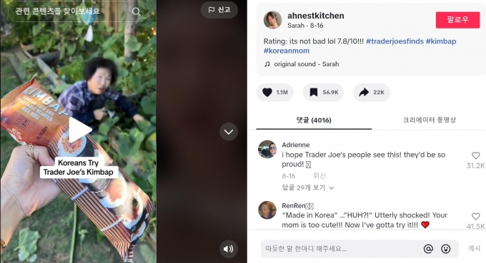 미국 전역에 500여개 매장을 둔 트레이더조스는 지난달초 이 냉동김밥을 출시했다. 이 제품이 출시되자, 로스앤젤레스(LA) 오렌지카운티에 거주하는 한식블로거 세라 안(27)이 어머니와 함께 이 김밥을 데워먹는 영상을 지난달 16일 틱톡에 올렸다.