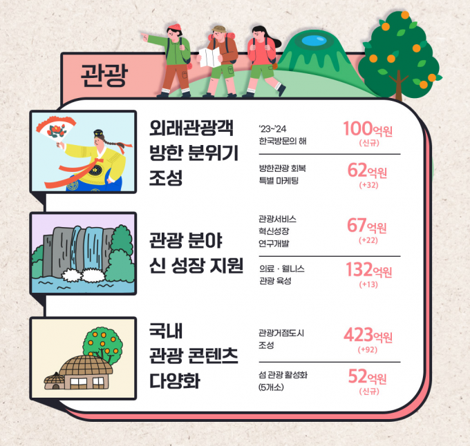 문화체육관광부가 관광분야 예산을 정부지출 증가율 2.8%보다 3배 이상 많은 10.7% 증액한 것은 '2024 한국방문의 해'에 맞춰 코로나 팬데믹 이후 감소했던 해외관광객을 적극 유치하겠다는 계획으로 보인다.