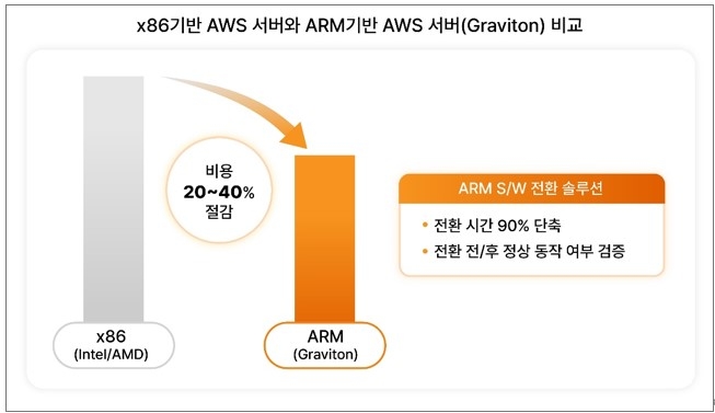 SKT가 이번에 출시한 솔루션은 AWS 기반 클라우드 비용 최적화 솔루션으로, 상대적으로 전력소비가 높은 인텔/AMD 기반 서버에서 저전력, 고효율 중앙처리장치(CPU)인 암(ARM) 기반 서버로의 이전을 지원해 운용비용을 20%에서 최대 40%까지 절감할 수 있다.