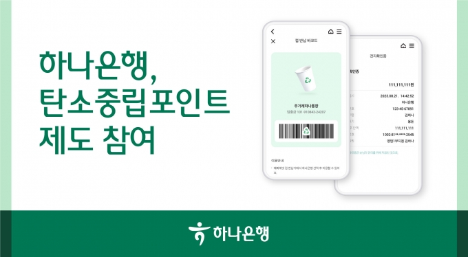 이에 따라 하나은행은 영업점에서 종이대신 전자확인증을 받는 사람은 1건당 100원의 탄소중립포인트가 주어진다. 또 커피전문점 등에서 일회용컵 대신 다회용컵을 사용하고 하나원큐앱에서 '컵반납 바코드'를 통해 컵보증금을 환급받으면 1건당 탄소중립포인트 300원을 받을 수 있다.