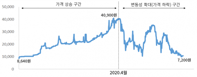 대한상공회의소가 13일 발간한 '국내 온실가스 배출권거래제 가격동향과 정책과제' 보고서에 따르면 지난 2015년 1월 8640원으로 첫 거래가 시작된 국내 배출권거래제 가격은 2020년초 4만2500원까지 상승했다가 2020년 4월부터 급등락을 반복하면서 올 7월에는 역대 최저치인 7020원까지 하락했다.