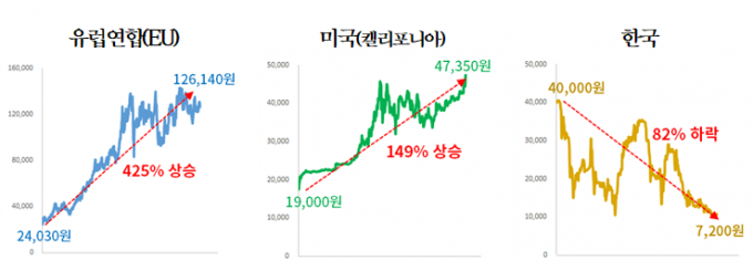 일각에서는 국내 배출권 가격이 하락하는 원인으로 코로나19에 따른 배출량 감소를 지목했지만, 주요 원인은 될 수 없다는 게 대한상의의 설명이다. 지난해 우리나라 온실가스 배출량은 2018년보다 10% 하락한 6억5500만톤으로 잠정 집계됐다. 유럽연합(EU)과 미국 등 주요국도 배출량이 감소했지만, 2020년 4월 이후 유럽은 400% 이상, 미국은 150% 가까이 배출권 가격이 꾸준히 상승하고 있다.