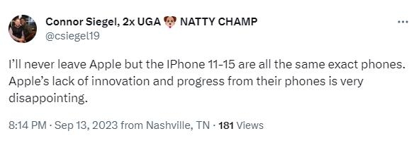팀 쿡 애플 최고경영자(CEO)는 "아이폰15는 지금까지 제품 중 가장 혁신적이고 강력한 스마트폰이라고 확신한다"고 강조했지만 소셜서비스(SNS)에서는 아이폰 이용자들의 날선 비판이 연일 이어지고 있다.