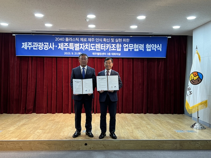 양 기관은 지난 21일 제주웰컴센터 3층 대회의실에서 '2040 플라스틱 제로 제주 인식 확산 및 실현을 위한 업무협약'을 체결했다고 22일 밝혔다.