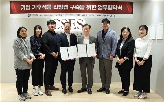 SK사회적가치연구원은 지난 25일 연세대 기후적응 리빙랩 연구사업단과 '리빙랩 기반 지역 기후변화 적응경로와 공간 계획 및 주체별 의사 결정 지원 시스템 개발' 추진을 위한 업무협약을 체결했다고 27일 밝혔다.