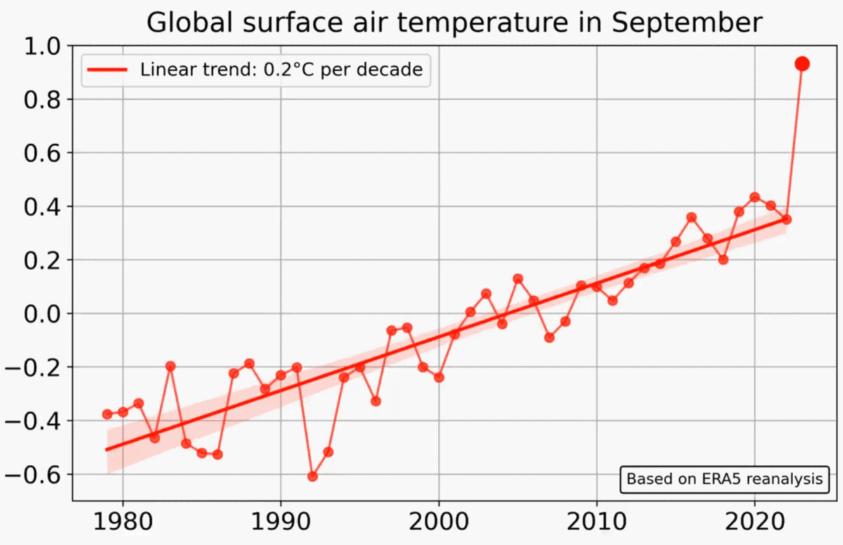 올 9월은 종전 최고치보다 0.5℃가량 높았고, 역대 9월 가운데 기온 상승폭이 가장 컸다. 1979년 이래 역대 9월 온난화 추세를 담은 ERA5 그래프에 2023년 9월 평균기온 좌표를 추가하자 기울기가 수직상승하는 모습을 보였다. 지난 40년동안 10년마다 0.2℃씩 올랐던 9월 평균기온 상승폭이 올해 수치를 입력한 것만으로 10% 늘어난 0.22℃를 기록한 것이다.
