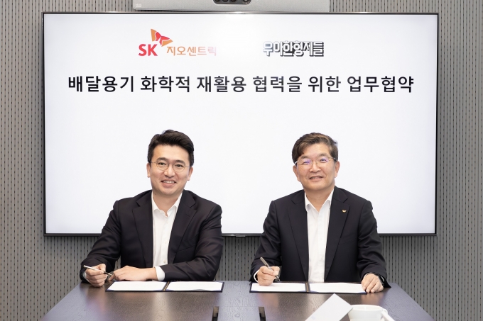 6일 SK지오센트릭과 우아한형제들은 서울 SK그린캠퍼스(종로타워빌딩)에서 '배달용기의 화학적 재활용 협력을 위한 업무협약(MOU)'을 체결했다. 양사는 재활용이 쉬운 배달용기의 개발과 보급을 통해 화학적 플라스틱 재활용 기술의 경제성을 높이겠다는 계획이다.