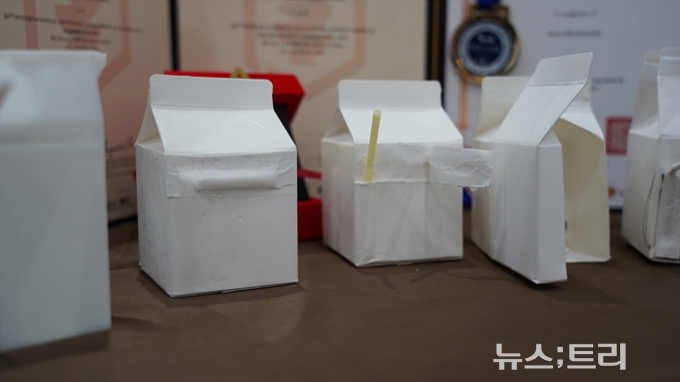 위니팩(We Need Package)에서 전시한 '빨대 우유팩'은 우유팩 옆쪽에 'ㄱ'자 모양으로 빨대가 일체형으로 부착돼 있어, 빨대를 돌려 살짝 누르면 우유팩 하단부가 뚫리면서 우유를 마실 수 있도록 디자인돼 있다. 빨대와 빨대를 덮고 있는 외지 모두 우유팩과 같은 재질의 종이로 100% 재활용 가능하다는 게 회사측 설명이다.
