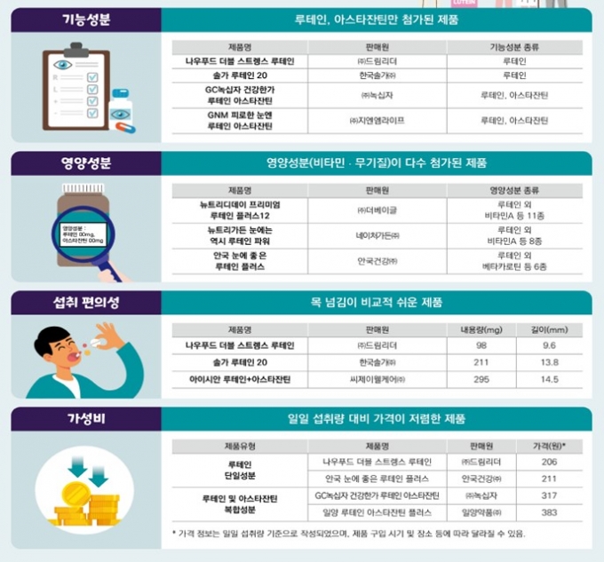 루테인 및 아스타잔틴 복합성분 제품 6종의 가격은 최소 317원~최대 765원으로 녹십자의 'GC녹십자 건강한가 루테인 아스타잔틴'이 317원으로 가장 저렴했고, 종근당건강의 '아이클리어 루테인 아스타잔틴'이 765원으로 가장 비쌌다.