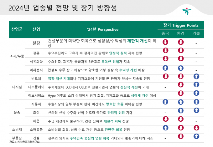 하나은행 하나금융경영연구소가 18일 발간한 '2024년 일반산업 전망' 보고서에 따르면 단기적으로는 '미중 갈등 심화', 장기적으로는 '글로벌 환경규제 강화'가 국내 산업에 악재로 작용할 전망이다. 특히 석유화학 분야는 수요위축·고유가·공급과잉의 3중고로 2024년 혹독한 침체를 경험할 수 있다는 우려다.