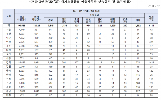 18일 국회 환경노동위원회 소속 이주환 국민의힘 의원이 환경부로부터 제출받은 '대기오염물질 배출사업장 단속실적 및 조치결과' 자료에 따르면 2020년부터 지난해까지 최근 3년간 9만9588개소를 점검한 결과 적발된 사업장이 1만3325개소에 달했다.
