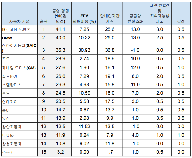 종합 순위가 각각 1위, 2위로 최상위권을 차지한 독일 메르세데스-벤츠와 BMW는 탈내연기관 및 공급망 탈탄소화 계획 등에서 다른 기업에 비해 높은 점수를 받았다. 하지만 양사 역시 내연기관차 판매비중이 높아 '1.5℃ 목표'에는 부합하지 않는다는 평가다.