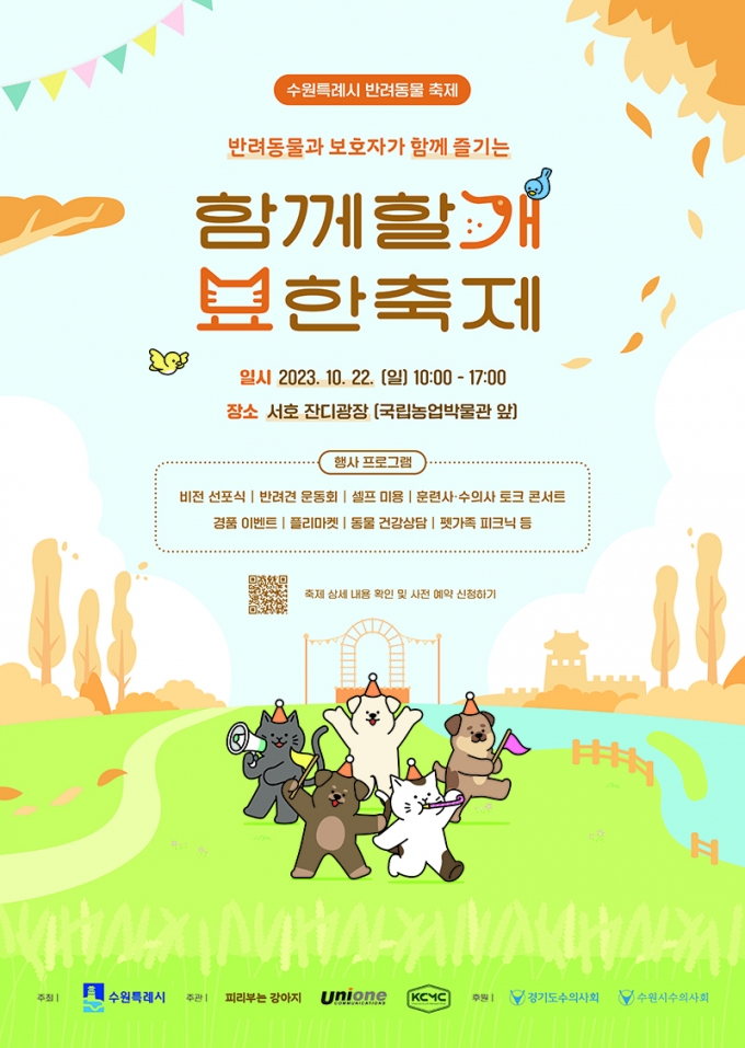 수원특례시가 선진 반려동물 문화 정착을 위한 사업 추진의 일환으로 '함께할개 묘한 축제'를 오는 22일 수원 서호 잔디광장(국립농업박물관 앞)에서 개최한다.