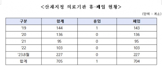 국회 환경노동위원회 소속 이주환 국민의힘 의원이 근로복지공단으로부터 제출받은 자료에 따르면 지난 2019년~2023년 8월 산재지정 의료기관 중 휴‧폐업한 기관은 705곳이다.