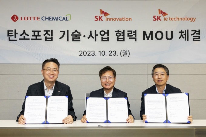SK이노베이션, SK아이이테크놀로지가 롯데케미칼과 함께 탄소포집·활용·저장(CCUS:Carbon Capture, Utilization and Storage)의 핵심인 탄소포집 분야의 경쟁력을 강화하기 위한 기술 및 사업협력 업무협약(MOU)을 23일 체결했다.