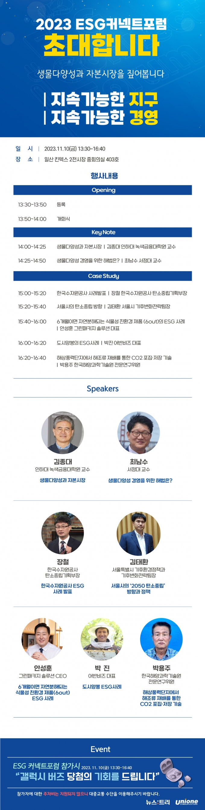 뉴스트리는 유니원커뮤니케이션즈와 오는 11월 10일 일산 킨텍스 제2전시장 중회의실에서 개최하는 '2023 ESG커넥트포럼'에서 최근 ESG경영에 핫이슈로 떠오르는 '생물다양성'이 자본시장에 어떤 영향을 미치고, 기업들은 어떻게 대응해야 하는지를 짚어보고자 합니다. '지속가능한 지구, 지속가능한 경영'을 주제로 하는 이번 포럼에 관심있는 많은 분들의 참여를 기다립니다.