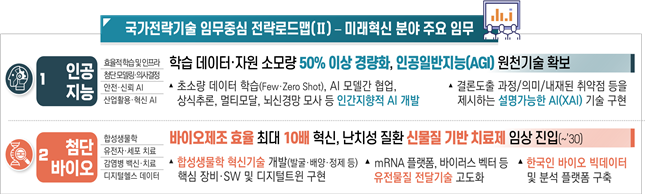 과학기술정보통신부는 31일 열린 국가과학기술자문회의 '국가전략기술 특별위원회' 4차 회의에서 인공지능(AI) 및 첨단바이오 등 미래혁신 분야의 '국가전략기술 임무중심 전략로드맵'을 심의·의결했다고 밝혔다. 이 로드맵에는 AI와 첨단바이오 분야에서 2030년까지 달성할 국가임무와 이를 위한 핵심 기술목표 및 투자·정책방향이 담겨있다.