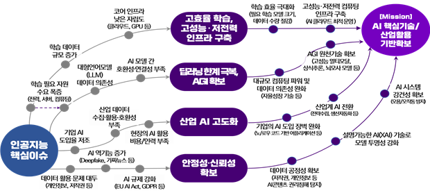 특히 AI는 신속한 기술추격을 통한 '신격차 창출'이 필요한 분야로, 자원의 열세를 딛고 주요국 기술대기업(빅테크) 중심의 경쟁구도를 뒤흔들 수 있는 고효율 AI학습모델 등 차세대·도전적 기술확보를 목표로 삼았다. 아울러 인공지능 신뢰성 확보 및 글로벌 규범 선도, 디지털·바이오 융합 본격화 등 범부처적으로 강조하고 있는 주요 의제를 적극 반영해 연구개발 투자·평가 혁신까지 일관성 있는 전략을 설정했다.