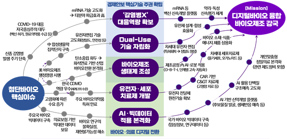또 2030년까지 난치성 질환의 신물질 치료제 임상 진입을 목표로 핵심 기반기술인 유전물질 전달(RNA 플랫폼·바이러스 벡터 등)과 함께 안전성이 확보된 차세대 세포치료제 개발을 추진하고, 감염병 대응 역시 백신플랫폼 중 타분야 파급효과가 높은 mRNA를 중심으로 고도화한다. 바이오의 디지털 전환을 추동할 한국인 바이오 빅데이터 구축(100만명 이상 목표) 및 클라우드 기반 분석 인프라 구축와 함께 생성형 AI를 적용한 신약후보 분석·질병진단 등 난제해결에도 도전한다.