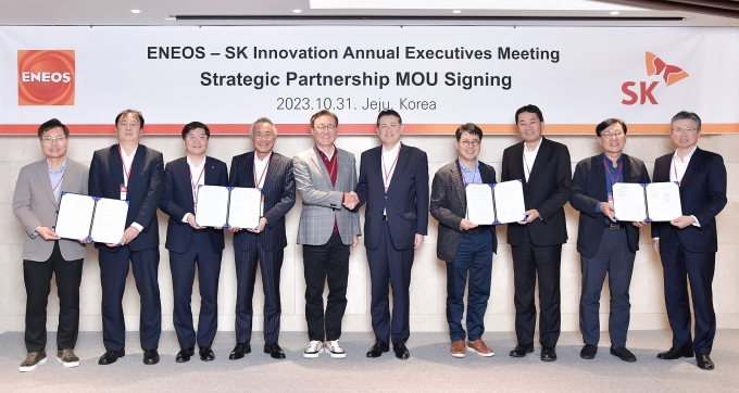 SK이노베이션과 에네오스 경영진은 지난달 31일 제주 서귀포시에서 '경영진 회의'를 열고 지금까지의 협력 성과를 돌아보며 앞으로의 협력 의지를 다졌다고 1일 밝혔다. 2007년 시작된 이 행사는 매년 한국과 일본을 대표하는 종합 에너지기업의 최고 경영진이 모여 양국 에너지업계의 현안을 공유하고 협력 방안을 논의하는 자리다. 코로나19로 2020~2022년 열리지 못하다 올해 협력범위를 확대해 재개됐다.
