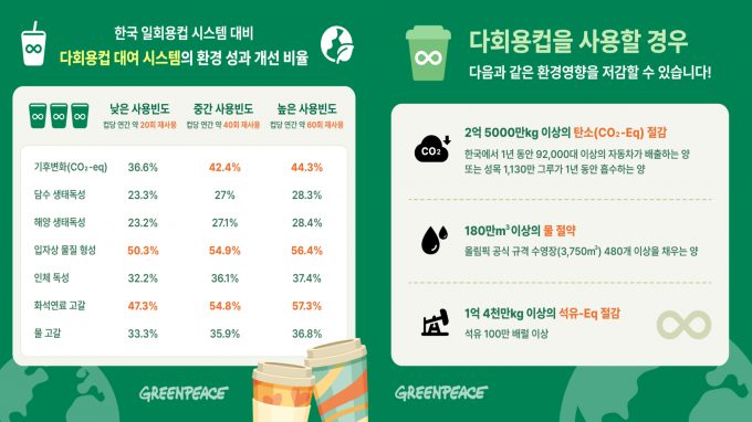 그린피스가 7일 발간한 '동아시아 다회용컵 및 일회용컵 시스템의 환경성과 전과정 평가(LCA) 비교' 보고서에 따르면, 한해 84억개씩 버려지는 일회용컵을 다회용컵으로 전환했을 때 국내에서만 연간 최대 25만톤의 이산화탄소를 저감할 수 있는 것으로 분석됐다.