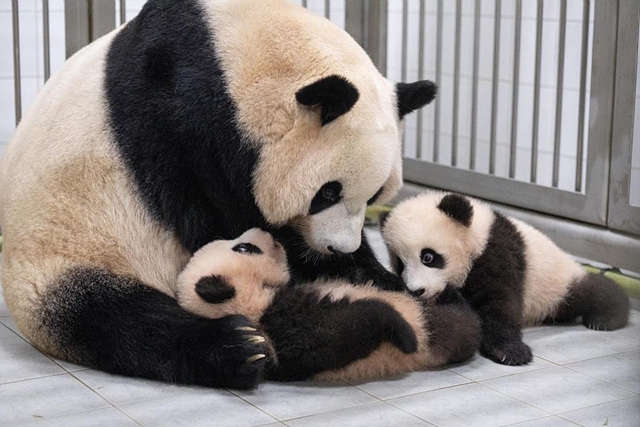 쌍둥이 판다가 태어난지 120일만에 하루종일 어미와 함께 지내게 됐다.