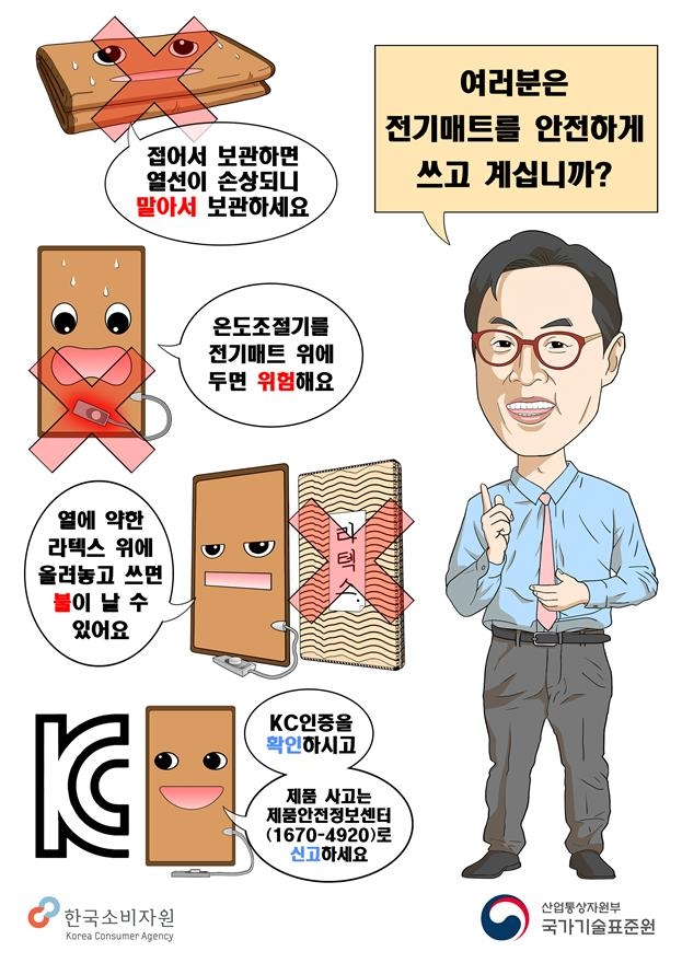 이에 국표원과 소비자원은 이날 전기매트 사용·보관 주의사항과 KC 인증 확인 필요성, 화재시 신고 방법 등을 담은 화재 사고 예방 홍보 포스터를 제작해 온라인으로 배포했다.