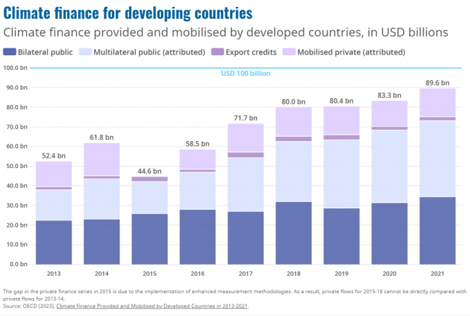 경제협력개발기구(OECD)가 16일(현지시간) 발표한 자료에 따르면 부유국의 개발도상국 기후지원금은 2020년 830억달러, 2021년 896억달러가 지급됐고, 2022년 처음으로 1000달러를 넘어설 것으로 전망되고 있다. OECD는 "아직 지난해 기후 지원재정을 모두 집계하지 않았지만 그간의 추세와 예비 데이터를 종합했을 때, 2022년 지원금은 1000억달러 이상 투입된 것으로 확신한다"고 밝혔다.