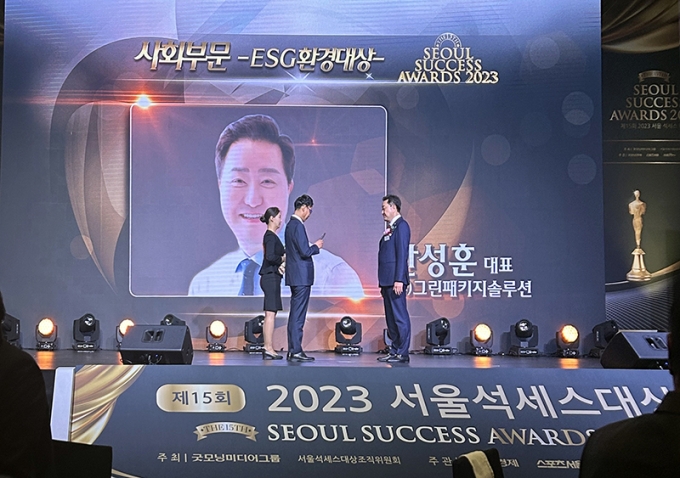 친환경 신소재 패키지 기업 '그린패키지솔루션'이 '제15회 2023 서울석세스대상'에서 사회부문 ESG 환경대상을 받았다.
