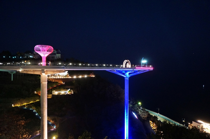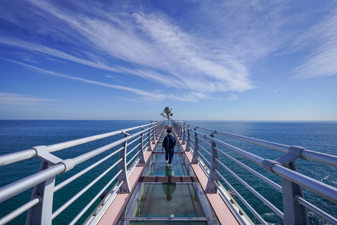 지난 2018년 첫선을 보인 등기산 스카이워크는 길이 135m에 발아래 푸른 바다가 훤히 내려다보이는 강화유리 구간만 57m다. 높이 20m에 설치해 멀리서도 존재감을 뽐낸다.