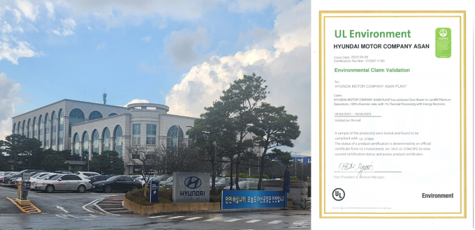 24일 현대차는 아산공장이 국제 안전과학 인증기관 'UL솔루션'(UL Solutions)의 '폐기물 매립 제로'(Zero Waste To Landfill) 인증에서 완성차 제조기업 중 최초로 가장 높은 플래티넘(Platinum) 등급을 최근 획득했다고 밝혔다.