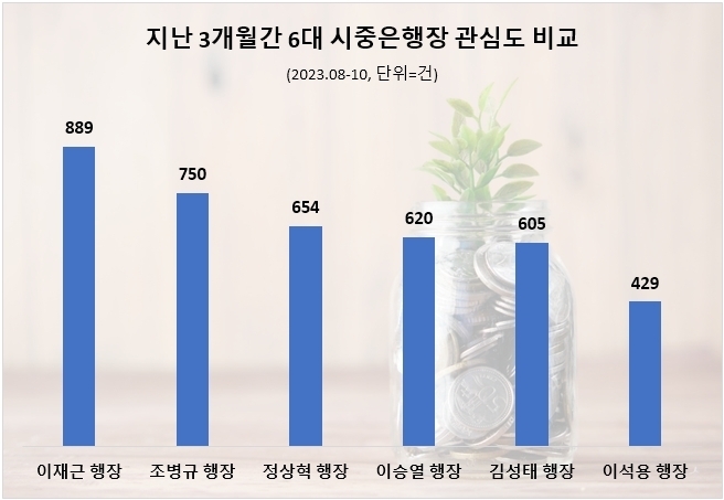 6대 시중은행 가운데 최근 3개월동안 금융소비자들에게 가장 관심을 많이 끈 은행장은 이재근 KB국민은행장으로 나타났다.