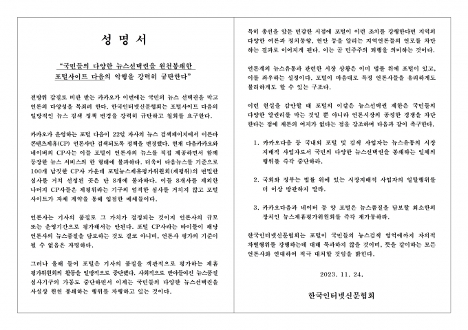 따라서 협회는 △국내외 포털 및 검색 사업자의 뉴스선택권 봉쇄 행위 중단 △뉴스제휴평가위원회 재가동 등을 요구하며, 국회와 정부로도 하여금 관련 방지책 마련을 촉구했다.