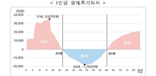 1인당 생애주기로 보면 소비가 가장 많은 시기는 17세로 1인당 3575만원을 썼다. 인생주기에서 소득없이 소비가 가장 많으니 적자폭도 가장 많은 시기다. 고등학교 시기에 공공교육 소비로 1151만원을 지출하는 등 교육소비의 영향이 컸다. 1인당 노동소득은 43세가 3906만원으로 가장 많았다. 소득이 많다보니 43세 시기는 1792만원 흑자를 기록했다.