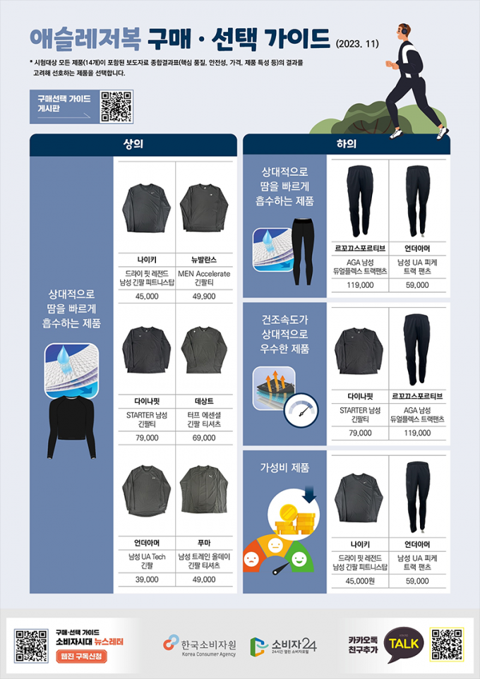 땀이나 물을 빠르게 흡수하고 건조하는 기능성은 상의 다이나핏 'STARTER 남성 긴팔티', 하의 르꼬끄스포르티브 'AGA 남성 듀얼플렉스 트랙팬츠' 제품이 가장 우수했다.