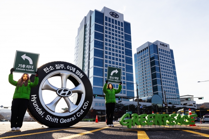 한편 이날 그린피스는 현대자동차그룹 양재 본사 앞에 지름 2.5m 크기의 거대한 타이어를 설치하고, '기후 리더'와 '탄소 악당' 사이 분기점에서 현대차의 선택을 묻는 퍼포먼스를 펼쳤다. 대형 타이어에는 '탄소 질주 이제 멈춰' 라는 문구를 새겨 현대차를 비롯한 자동차 제조사들의 기후위기 가속화 행태를 지적하고 강력한 기후 대응 리더십을 촉구했다.