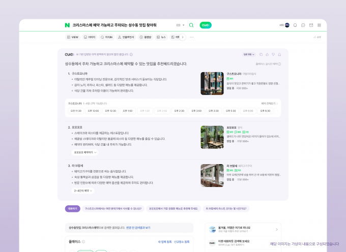 예를 들어 '크리스마스에 예약 가능하고 주차되는 성수동 맛집 찾아줘'라는 질문하면 조건에 부합하는 장소를 네이버 플레이스 정보와 예약 시스템을 연동해 검색 결과 상단에서 보여준다. 상품, 레시피, 장소 검색으로 시작해 쇼핑, 장보기, 예약 등 서비스와 연계해 별도의 추가 검색 없이 액션까지 연결된다.