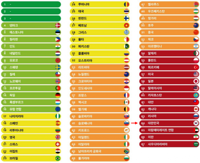 가장 높은 순위인 4위를 차지한 국가는 덴마크다. 한국은 64위를 차지했다. 1~3위가 비어있으니, 64개 평가대상 가운데 끝에서 네번째다. 한국보다 낮은 평가를 받은 국가는 달랑 3곳으로, UAE와 이란, 사우디아라비아 등 모두 산유국이다. 산유국들은 기본적으로 화석연료와 이해관계가 깊게 얽혀있으니, 우리나라 기후위기 대응정책이 사실상 전세계에서 꼴찌나 다름없는 셈이다.