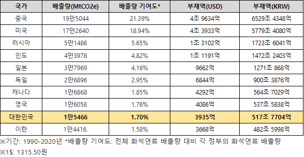 한국은 1990년부터 2020년까지 세계 온실가스 배출량의 1.7%, 세계 9위에 달하는 1만5466MtCO2e(이산화탄소환산 백만톤)의 온실가스를 배출했다.