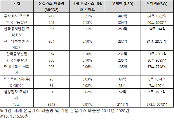 개별 기업 중에서는 포스코가 약 64조1882억원으로 가장 큰 기후부채를 안고 있었다. 현대제철의 기후부채는 약 17조7748억원, 포스코에너지는 약 8조4574억원, 에스오일이 7조100억원, 삼성전자는 6조9587억원에 달했다.