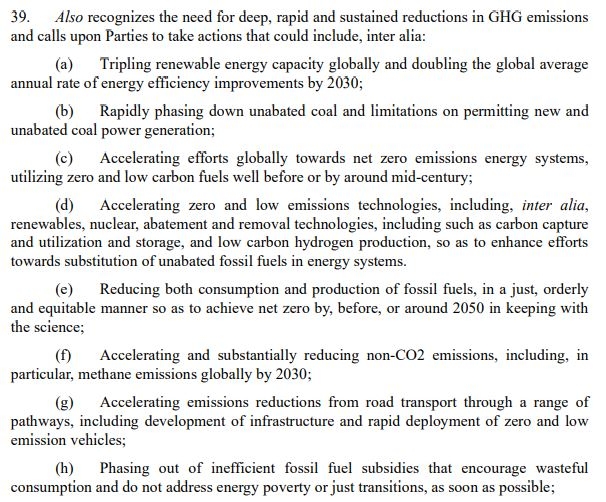 11일(현지시간) 아랍에미리트(UAE) 두바이에서 발표된 초안에는 "과학에 따라 2050년 이전 또는 그 무렵까지 탄소중립을 달성하기 위한 일환으로 정의롭고 질서있고 공평한 방식으로 화석연료의 소비와 생산을 모두 감축할 것"이라고 명시돼 있다. 하지만 '화석연료 단계적 퇴출 및 생산감축'이 명확하게 명시되지 않았다.