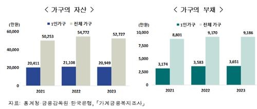1인가구의 자산은 2억949만원으로 전년보다 0.8% 감소했다. 이는 전체 가구평균 5억2727만원의 39.7% 수준이다. 부채는 3651만원으로 1.9% 늘었다. 이는 전체 가구평균 9186만원의 39.7%를 차지했다.